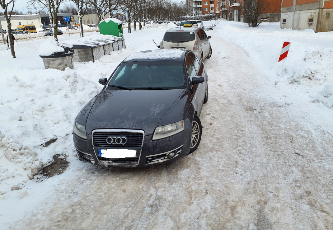 Dariaus ir Girėno g. 17 Gargždai, konteineriai nebuvo aptarnauti dėl užstatytų automobilių.